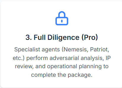 Unrivaled Diligence for Unrivaled Returns.Perfect for: Institutional VCs, Private Equity firms, and Corporate M&A teams who require a 360-degree, de-risked view of potential investments.The Foundry Plan is the ultimate intelligence edge. You get the full venture memorandum, then we put it through a gauntlet of adversarial, legal, and operational stress tests. We don’t just show you the opportunity; we show you how a competitor could kill it, how you should defend it, and how it could be perfectly postured for successful operation it post-investment. This is how you find true alpha.What's Included: